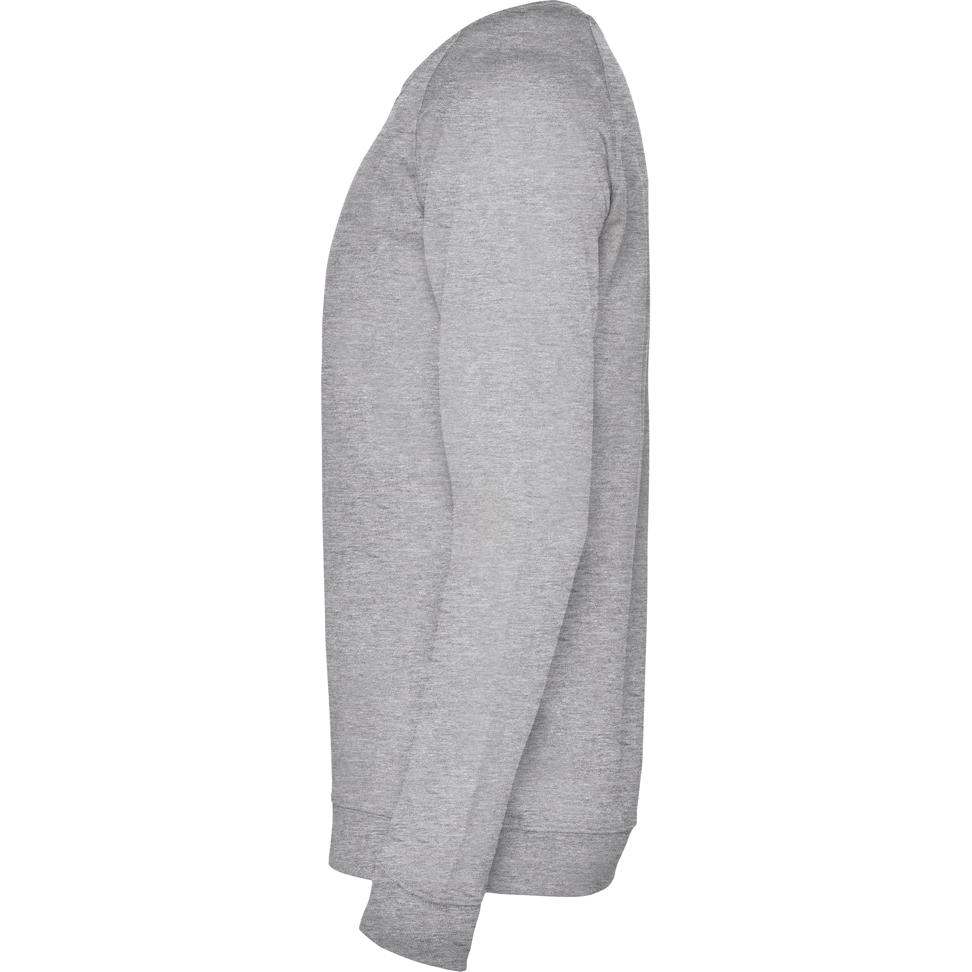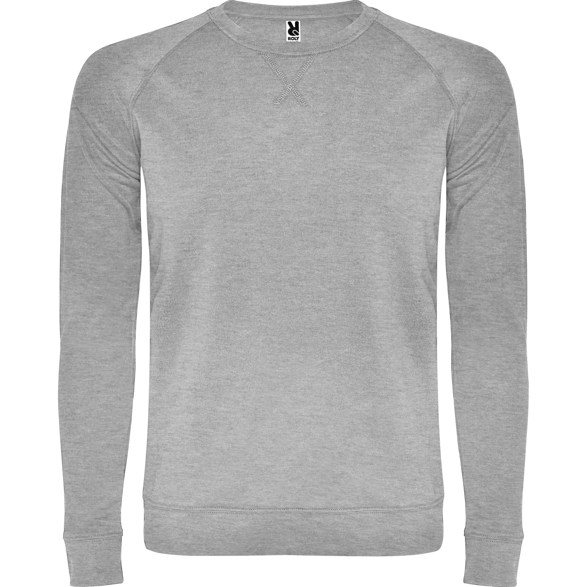 Sudadera unisex cuello redondo de algodón no perchado. Manga ranglan. Cuello, puños y cinturilla en canalé 2×1 con elastano. Adorno de costuras cruzadas remalladas. Cubrecosturas del mismo tejido.