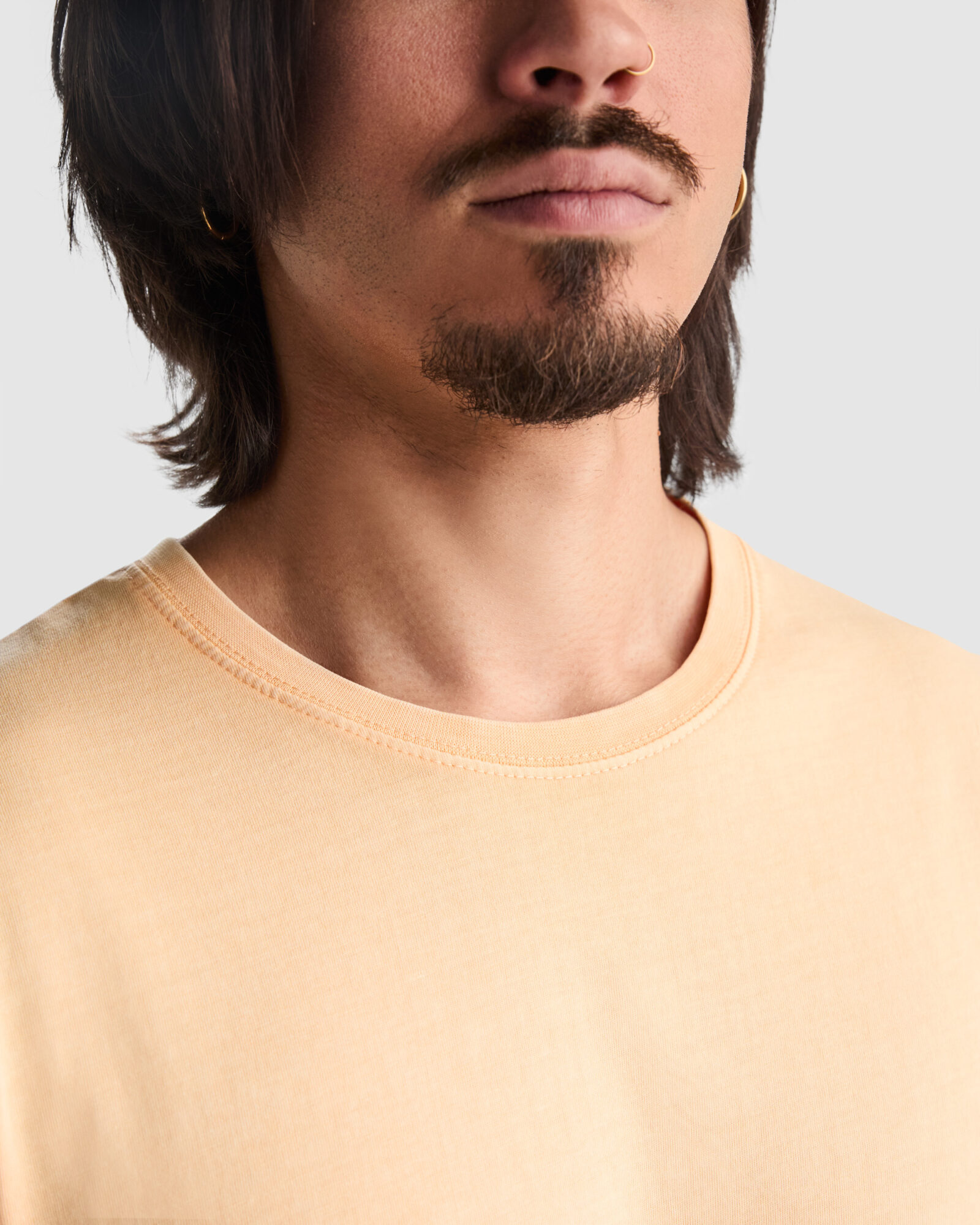 Camiseta man de manga corta en algodón peinado efecto lavado. Cuello redondo en canalé 1×1. Cubrecosturas en cuello del mismo tejido. Costuras dobles en laterales y sisas.