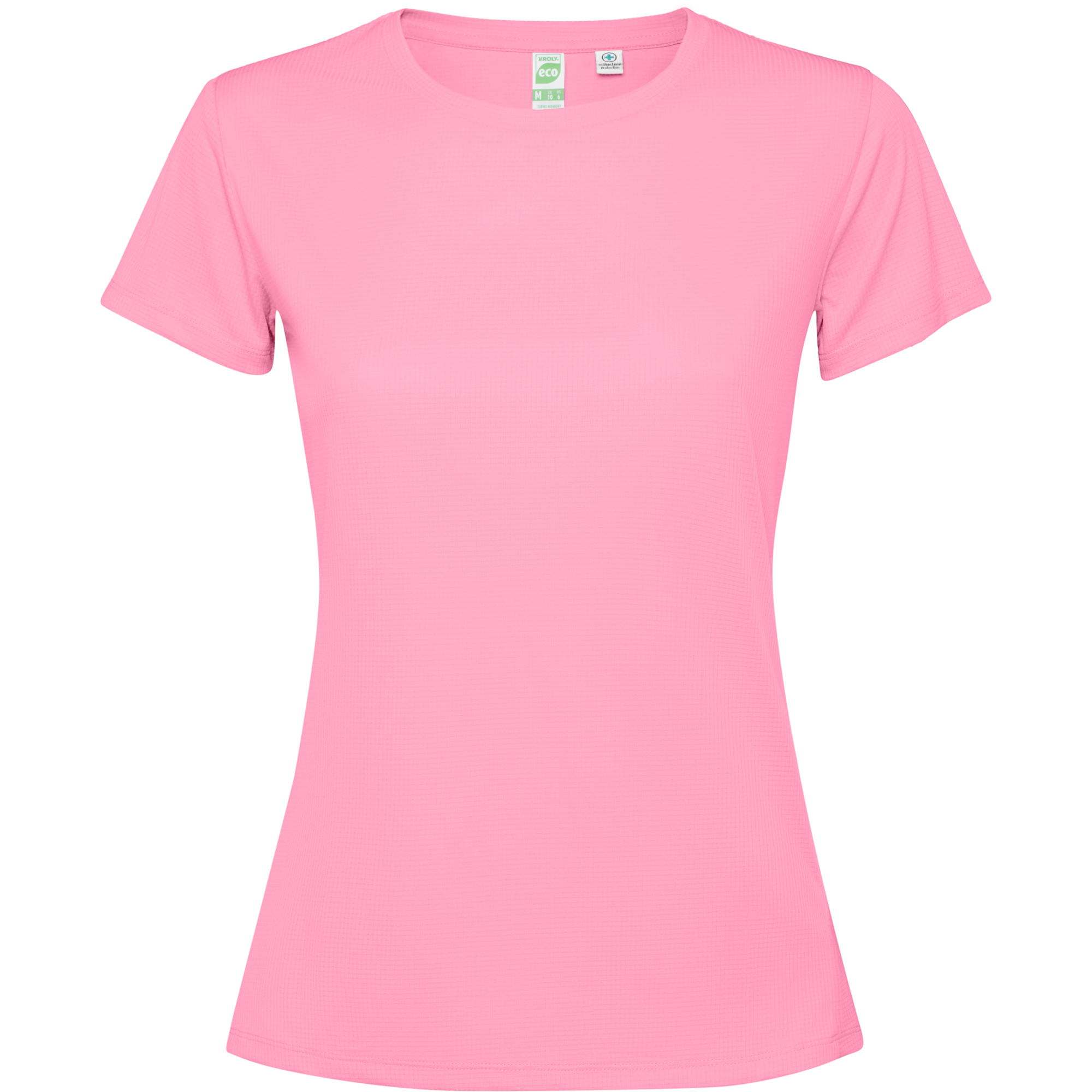 Camiseta técnica manga corta entallada transpirable. Roly Control Dry. Antibacteriano. Faldón trasero. Costuras laterales adelantadas. Cuello redondo y cubrecosturas del mismo tejido al tono. Certificado GRS.