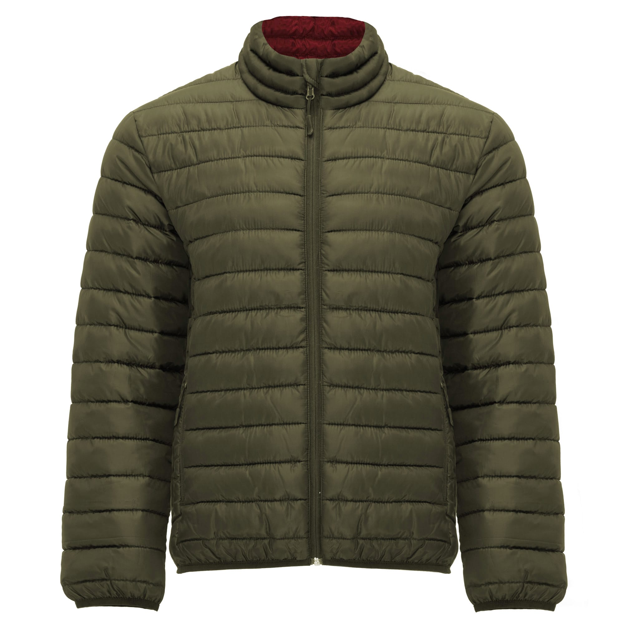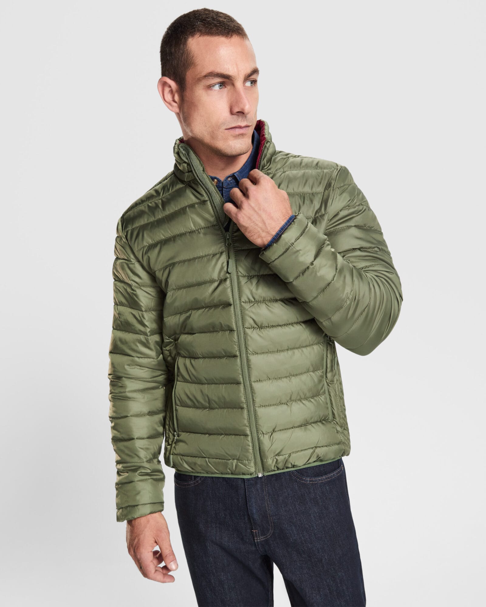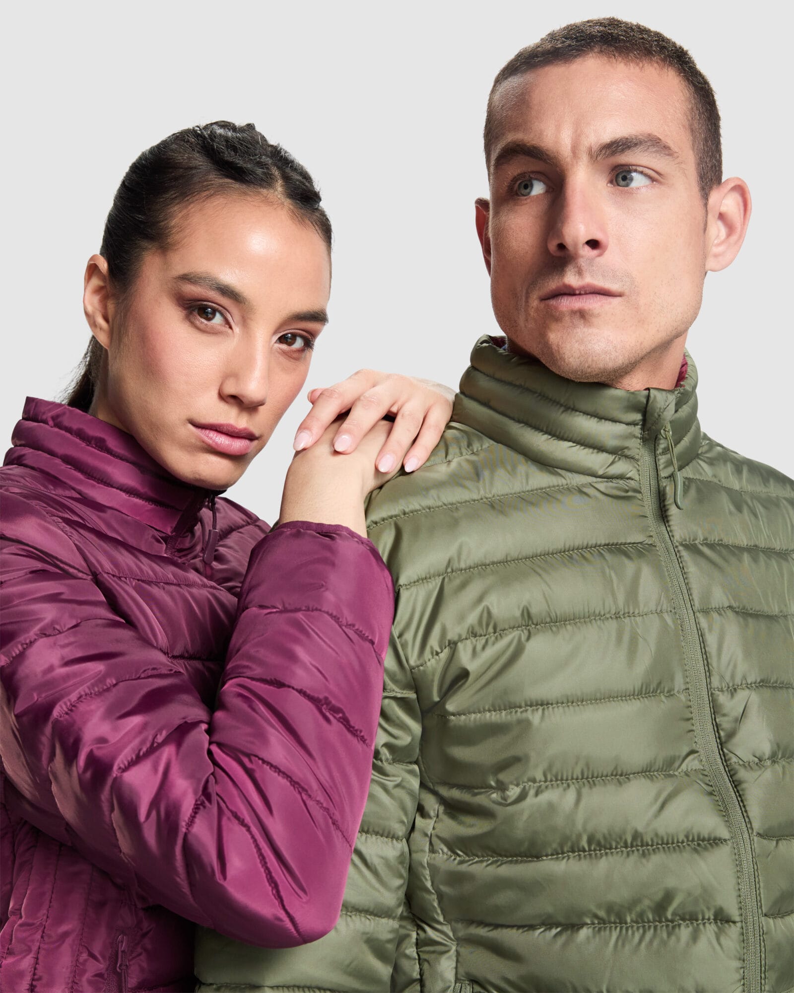 Chaqueta acolchada resistente al agua. Cremallera frontal invertida al tono con protector de barbilla del mismo tejido. Bolsillos laterales con cremalleras invertidas al tono insertado en los paneles laterales. Vivo elástico al tono en puños y bajo. Opción de colores lisos o a contraste en interior.