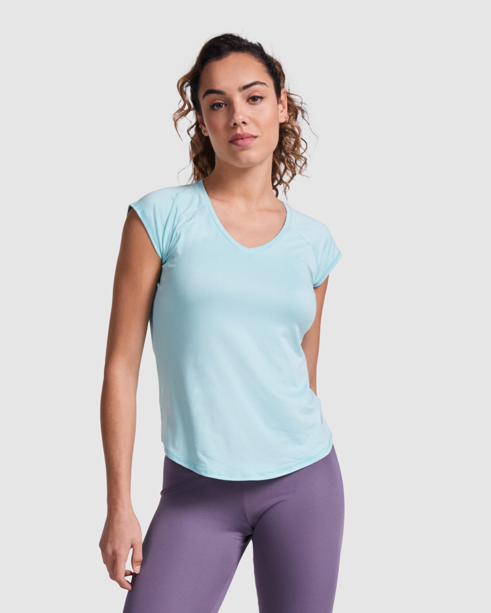 Camiseta técnica multideporte para mujer con manga ranglán. Cuello pico. Tejido poliéster con tacto algodón. Corte entallado. Bajo con forma curva. Costuras overlock a tono en bajo y mangas. Logo Roly reflectante en bajo lateral izquierdo.
