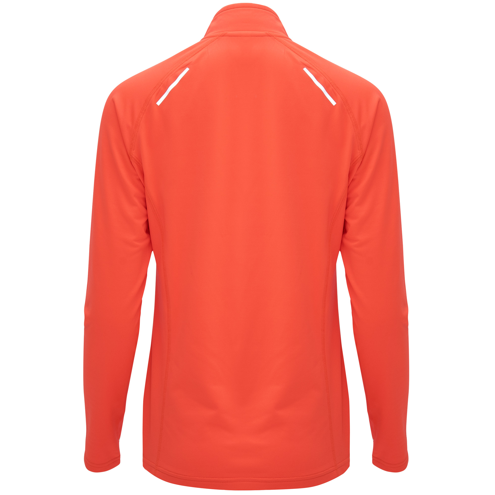 Sudadera técnica de manga larga ranglán para mujer con interior perchado. Cubrecosturas de refuerzo a contraste en el interior del cuello. Media cremallera invertida a tono con detalle reflectante. Puños con apertura para pulgar. El patronaje de la espalda es ligeramente más largo que el delantero. Detalles reflectantes en las espalda.
