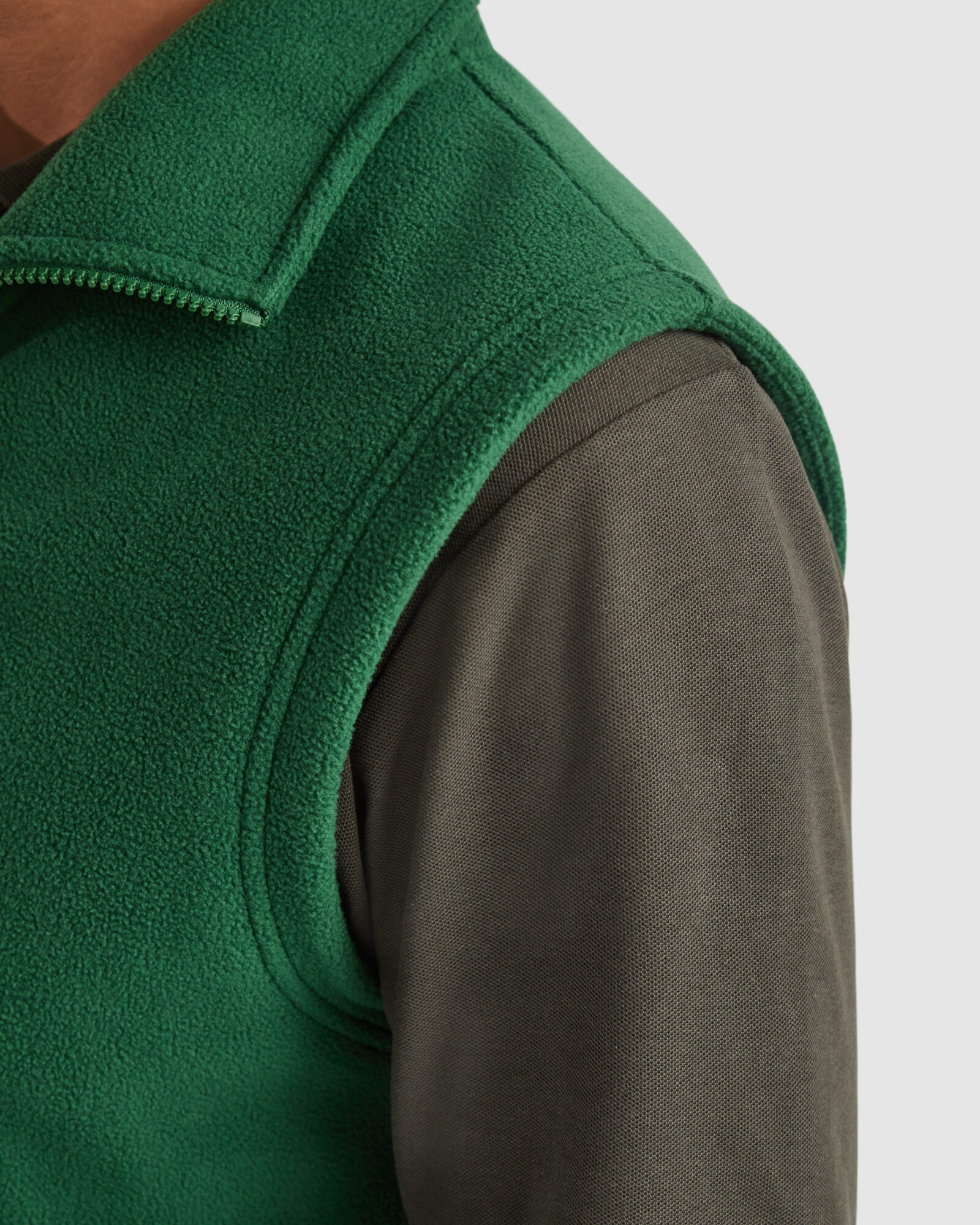 Chaleco polar con cremallera frontal. Cuello alto. Bolsillos con cremallera integrados en costuras de los paneles laterales. Cubrecosturas en cinta de espiga. Todos los accesorios al tono. Ajustadores laterales en el interior.