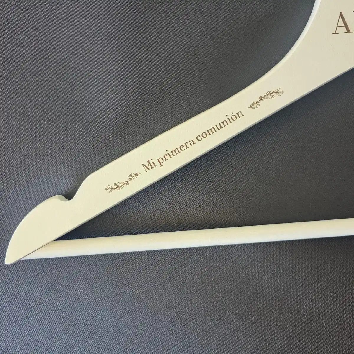 Fabricada en madera de alta calidad con acabado blanco elegante, no solo cumple su función práctica de colgar el vestido, sino que se transforma en un elemento decorativo ideal para las fotografías de comunión quecapturarán momentos irrepetibles. Cada percha es artesanalmente personalizada en el taller de Bórdate en Sanlúcar de Barrameda (Cádiz), garantizando un grabado nítido y duradero que mantendrá su belleza con el paso del tiempo. El regalo perfecto para que la comunión de la pequeña sea aún más especial.