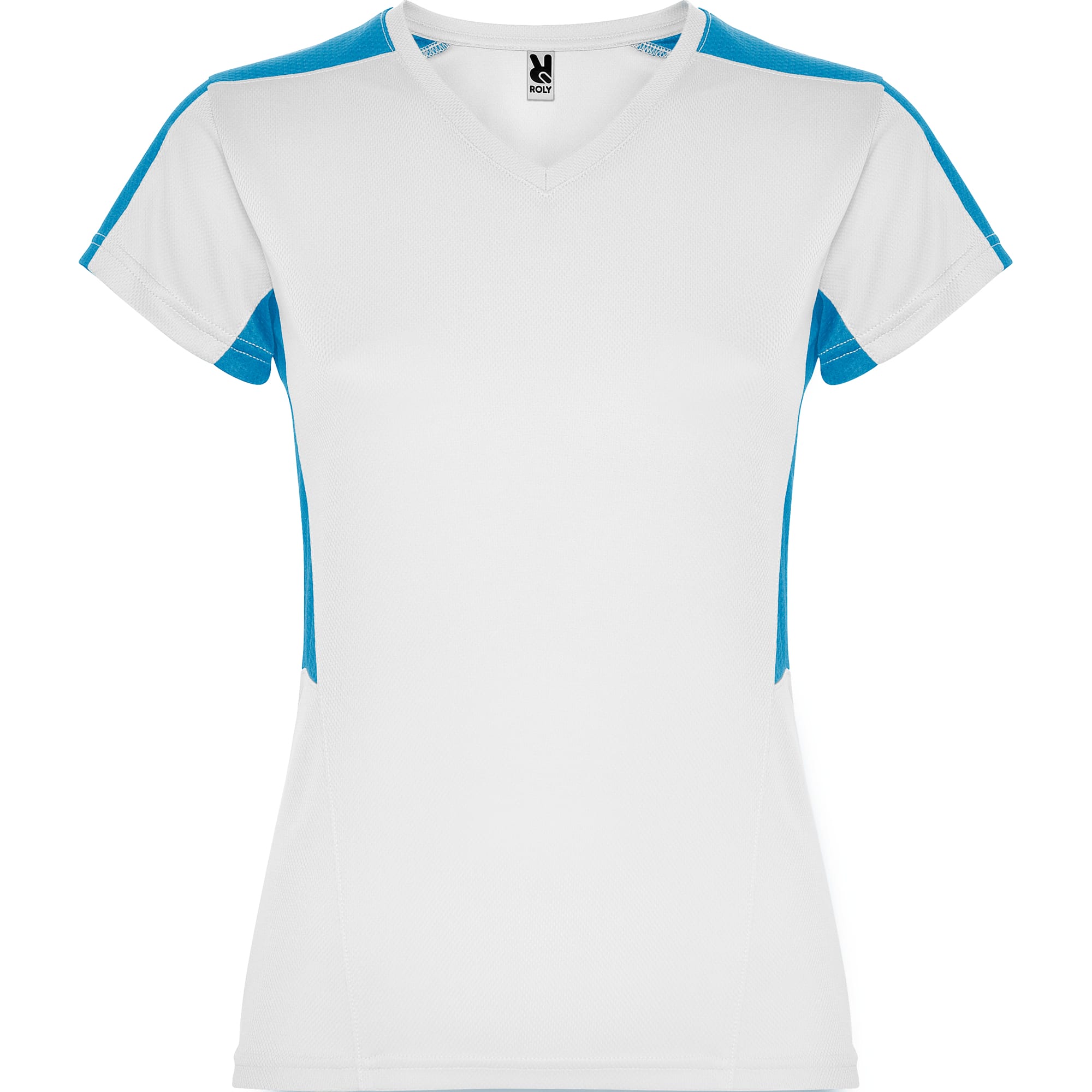 Camiseta técnica de manga corta para mujer con cuello pico. Combinada en laterales y hombros con dos tejidos de poliéster. Tejido principal bird´s eye y tejido rejilla 3D transpirable en hombros y paneles laterales. Tejido preparado para la absorción de humedad.