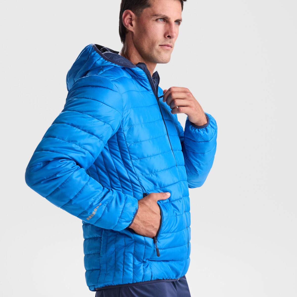 Parka acolchada combinada repelente al agua con capucha fija y visera. Cremallera frontal cubierta con una tapeta. Protector de barbilla del mismo tejido. Puños elásticos. Bolsillos laterales con cremalleras y ribeteados en el mismo tejido. Bolsillo interior en pecho izquierdo. Acceso interior para reprocesos.