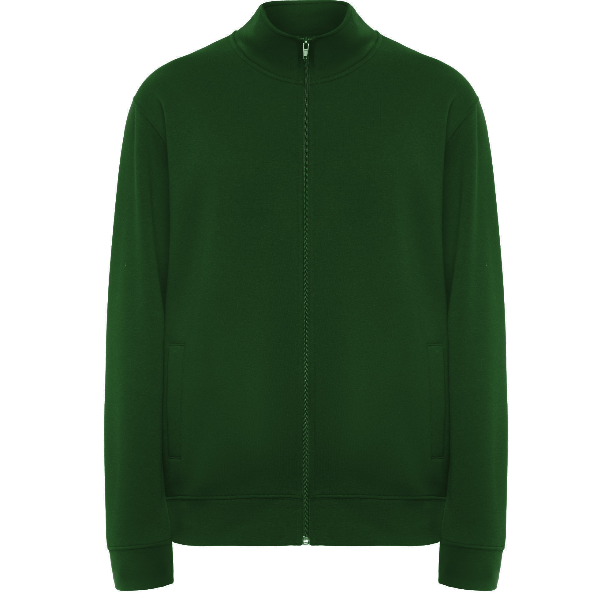 Sudadera unisex con cremallera frontal y cuello alto. Cremallera al tono. Dos bolsillos laterales con ribete del mismo tejido. Puños y cinturilla en canalé 2×1 con elastano. Cubrecosturas del mismo tejido.