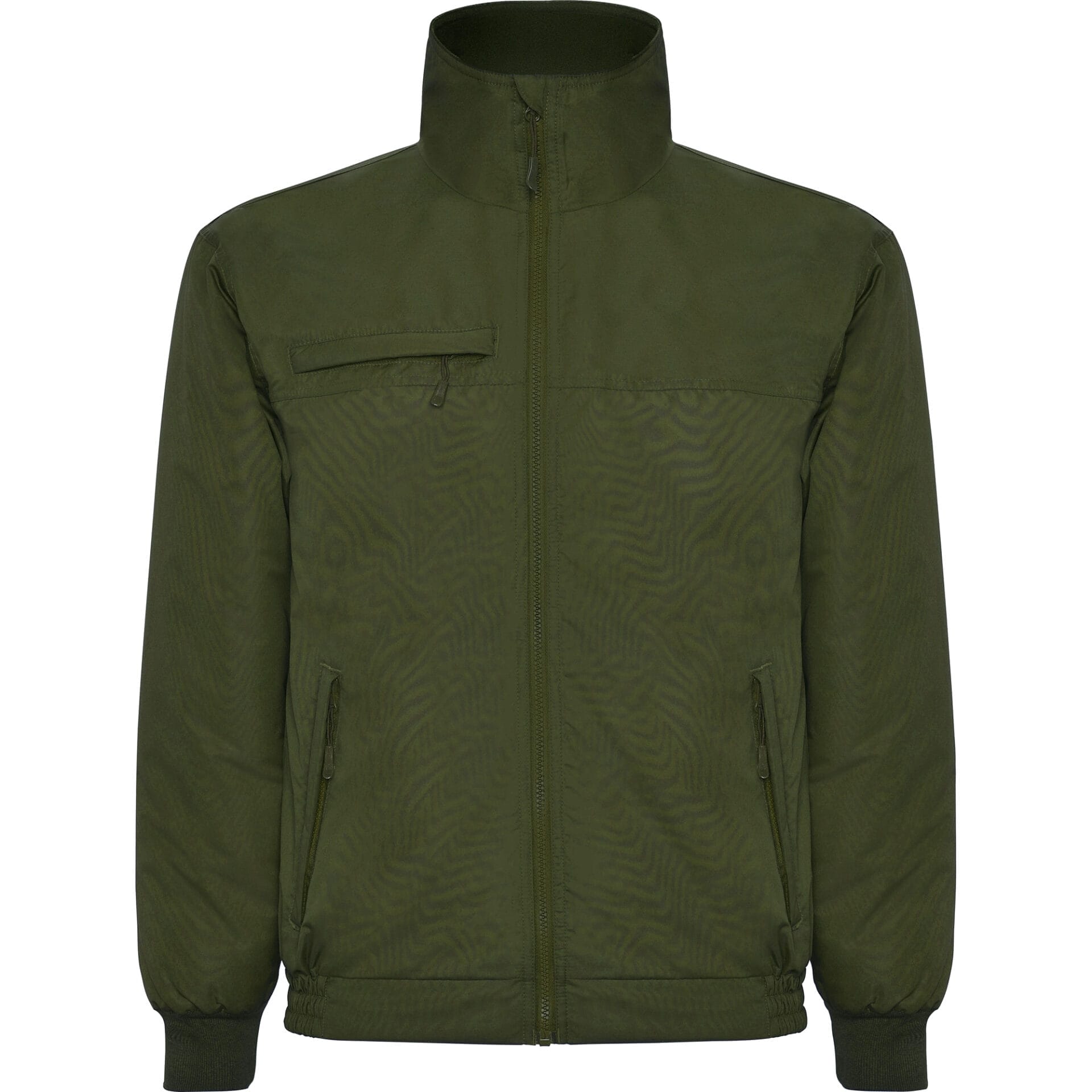 Chaqueta acolchada resistente al agua forrada en micropolar. Cremallera frontal al tono. Puños en canalé 1×1 y cintura engomada en los laterales. Bolsillos laterales y uno en pecho derecho con cremalleras al tono y cubiertos por una tapeta del mismo tejido. Acceso interior para reprocesos.